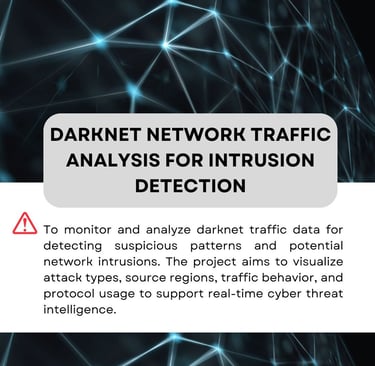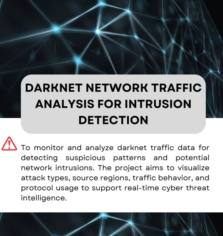 To analyze darknet network traffic data for detecting suspicious activities and potential intrusions. The project focuses on identifying anomalies, attack patterns, and malicious behavior using machine learning techniques and visualizing security insights through interactive dashboards.