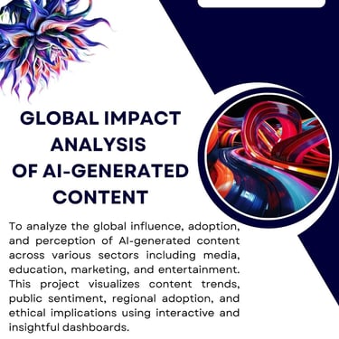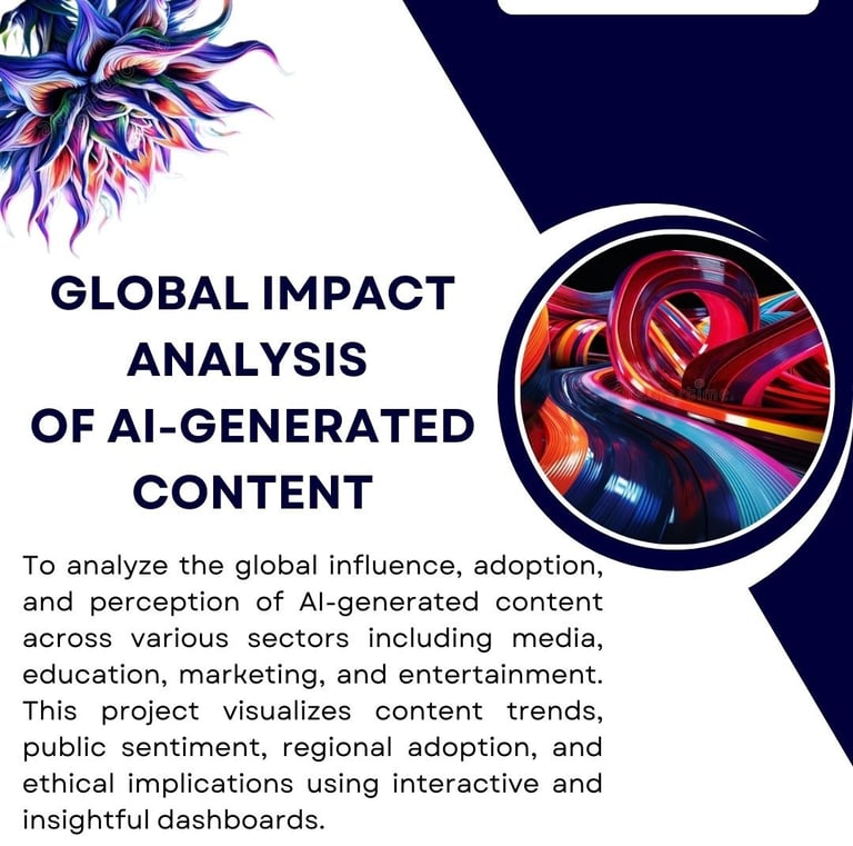 To analyze the global influence, adoption, and perception of AI-generated content across various sectors including media, education, marketing, and entertainment. This project visualizes content trends, public sentiment, regional adoption, and ethical implications using interactive and insightful dashboards.
